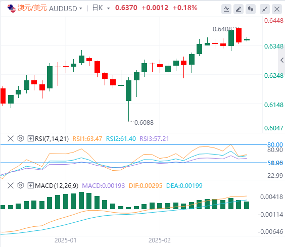澳元/美元在周一交易接近0.6370,处于反映市场看涨情绪的上升通道内。14日相对强弱指数(RSI)保持在50以上,支持积极的前景。