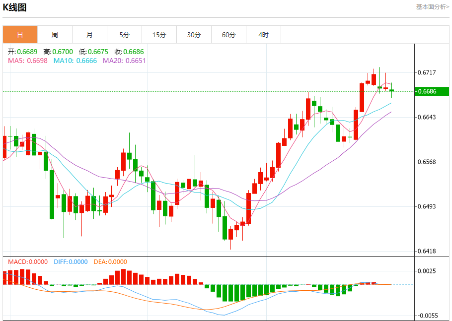 澳元兑美元今日汇率最高0.6693 ,最低0.6691 ,涨跌-0.0001,涨跌幅-0.02% 。