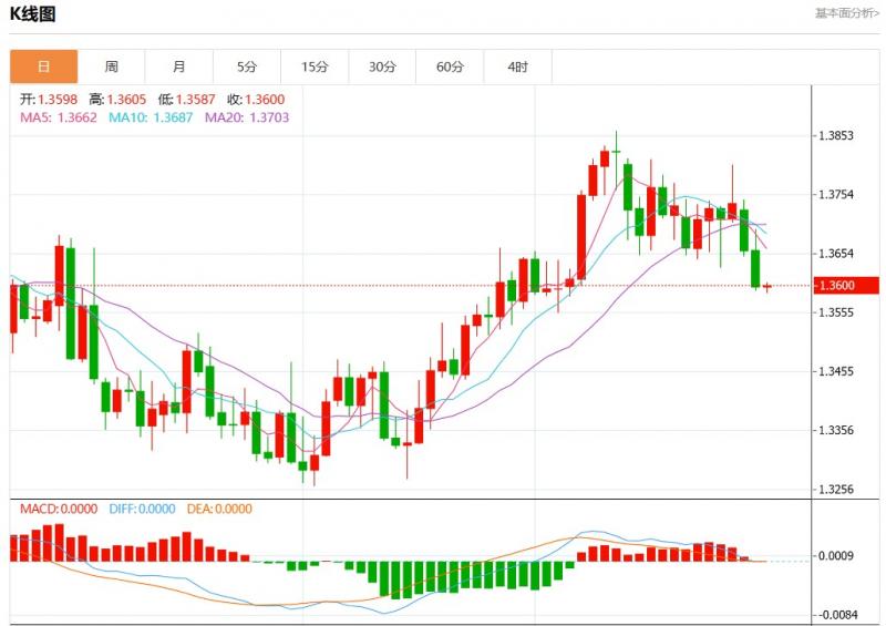 周三盘中,美元加元报1.3599,涨幅0.02%。