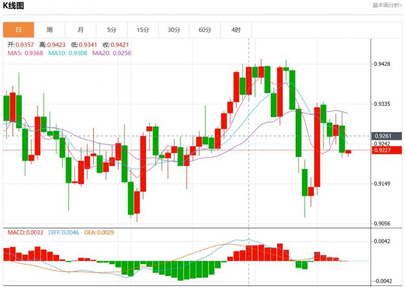 周三盘中,美元瑞郎报0.9228,涨幅0.07%。