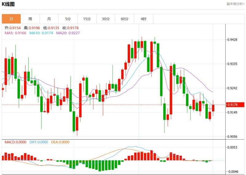 周一盘中,美元瑞郎报0.9179,涨幅0.20%。