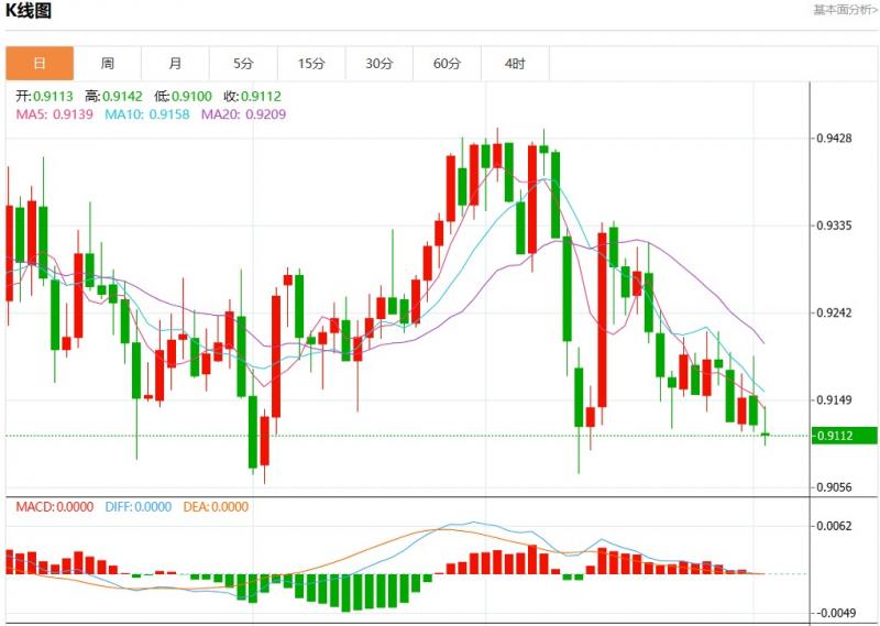 周二盘中,美元瑞郎报0.9112,跌幅0.13%。