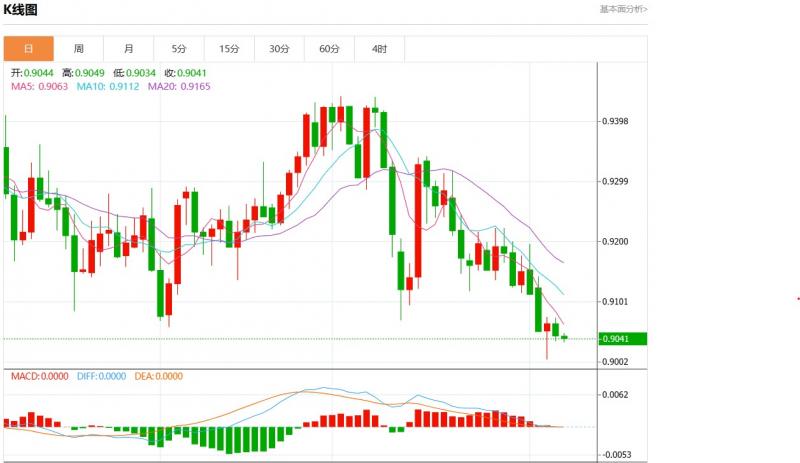 技术点评:RSI技术指标低于50。 MACD技术指标处在其信号线之上 看空。 另外,价位在其50天移动平均线以下 ( 0.9057 ) 但高于20天移动平均线 ( 0.9048 )。