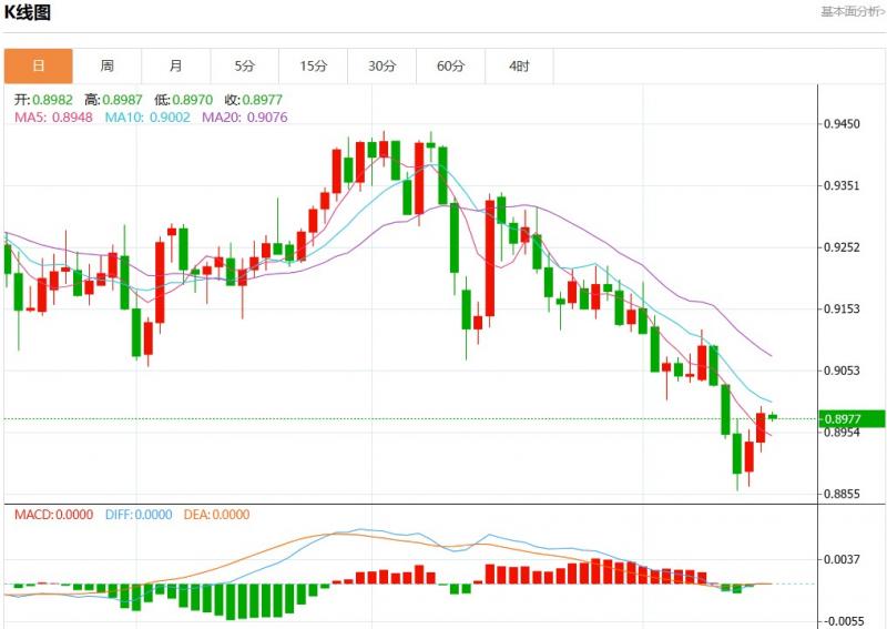 周二盘中,美元瑞郎报0.8977,跌幅0.09%。