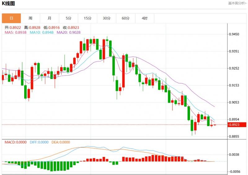 周一盘中,美元瑞郎报0.8923,涨幅0.01%。