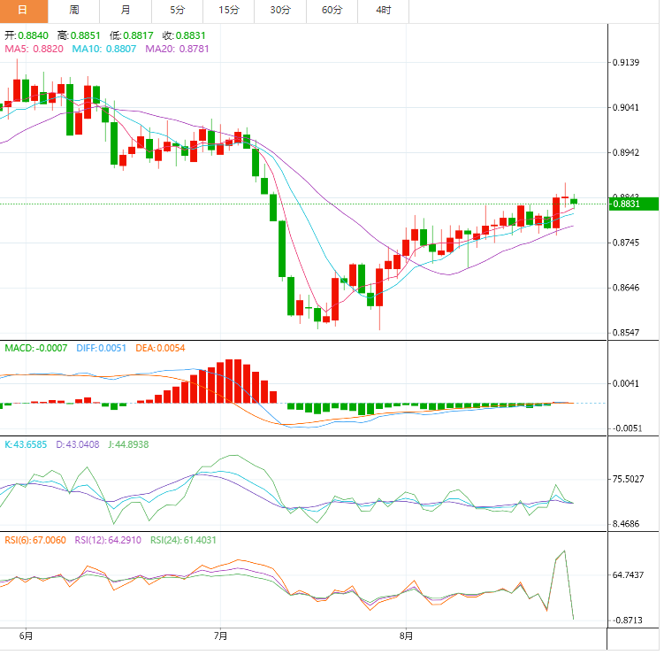 基本面上,美国国债收益率下跌,美元/瑞郎自数周高点0.8876回调。与此同时,衡量美元对其他六种主要货币价值的美元指数保持在 104.10 上方,接近月度高点。截至发稿时,美元/瑞郎报 0.8847,上涨 0.01%。