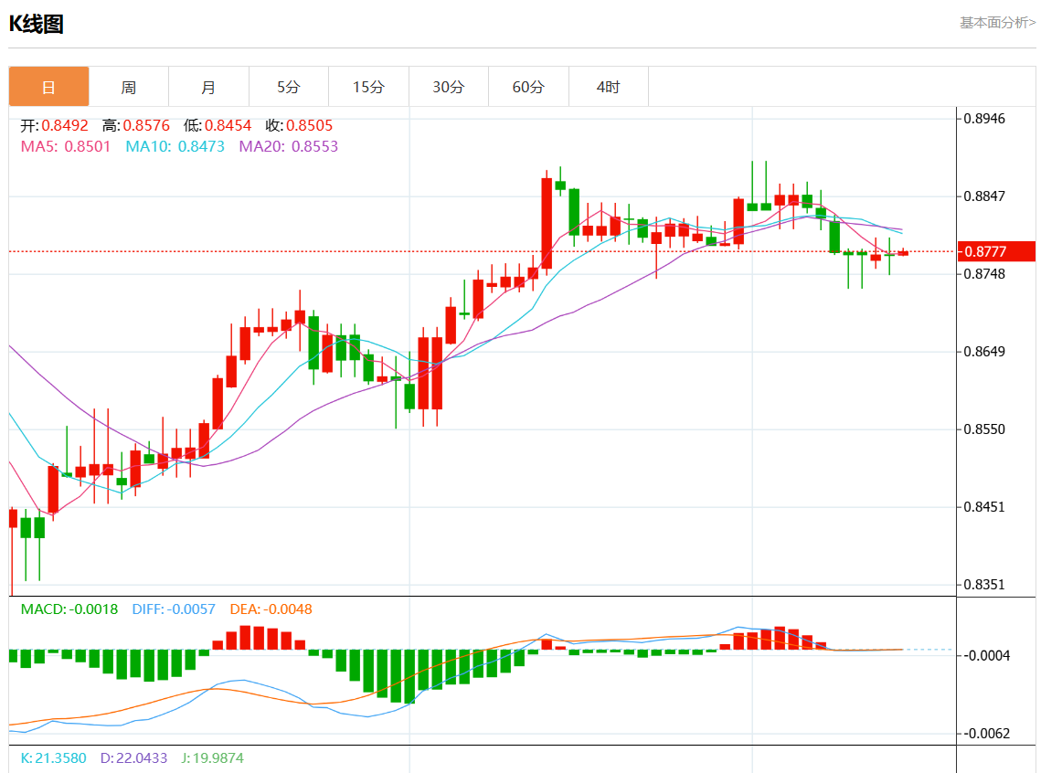 周三盘中,美元/瑞元报0.8780,涨幅0.09%。