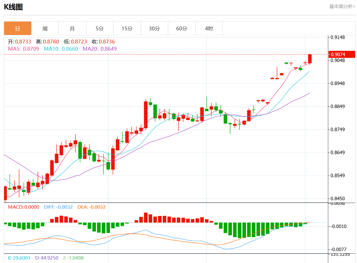 周二盘中,美元/瑞元报0.9075,涨幅0.36%。