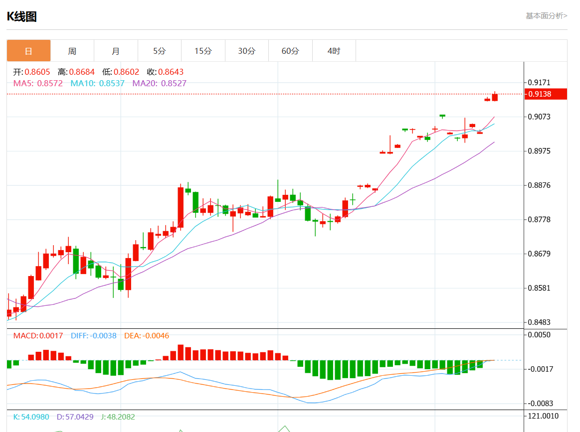 周四盘中,美元/瑞元报0.9138,涨幅0.11%。
