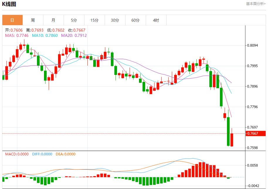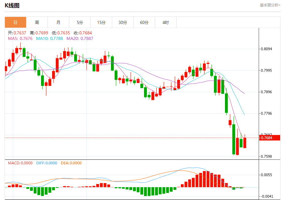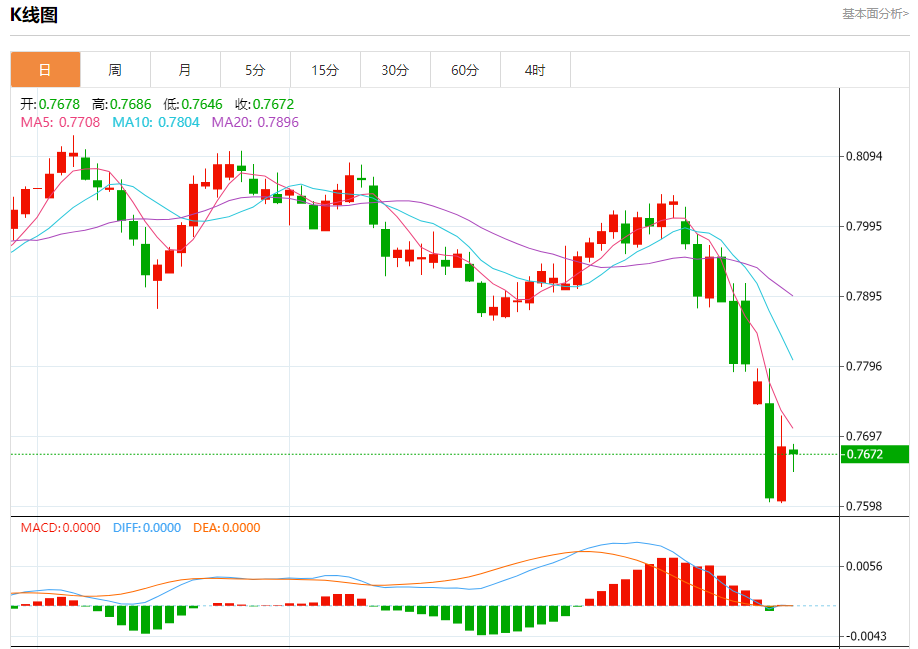 周五纽盘,瑞郎兑美元交投于0.7687,涨幅为0.58%。