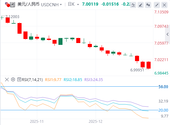 技术上,美元/人民币将进入一个关键的长期支撑区,介于6.9709(2024年低点)至38.2%回调6.3057(2022年低点)至7.4287(2025年高点6.9997)之间。该区内将出现强劲支撑以遏制下行。向上方面,7.0843支撑转为阻力的坚硬突破将确认短期见底,且7.4287形态的第一段很可能已结束。