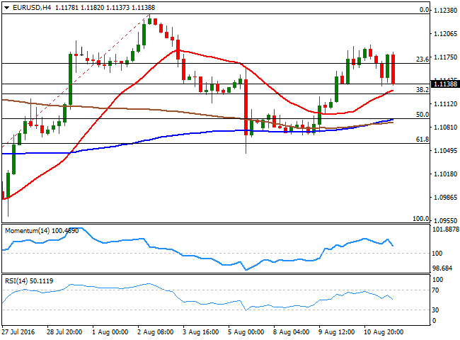 4小时图上,技术指标在正面领域下移,暗示周五欧元/美元将继续下滑。美国将公布7月零售销售数据(北京时间周五20:30),预期总体会较上个月下滑。如果数据进一步恶化,美元将以跌势结束本周,欧元/美元有望反弹至1.1235,即上周高点。