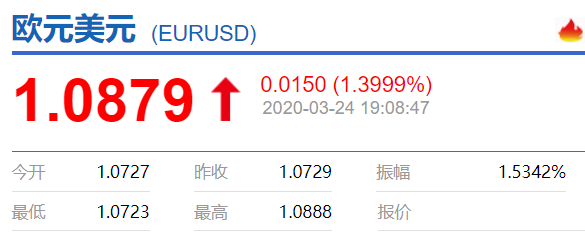 欧元兑美元EUR/USD涨幅扩大至1.5%,报1.0884