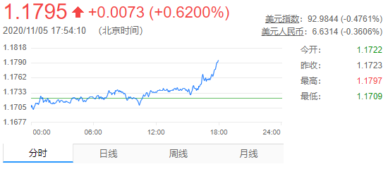 欧元兑美元刷新日高至1.1795,日内涨幅扩大到0.62%
