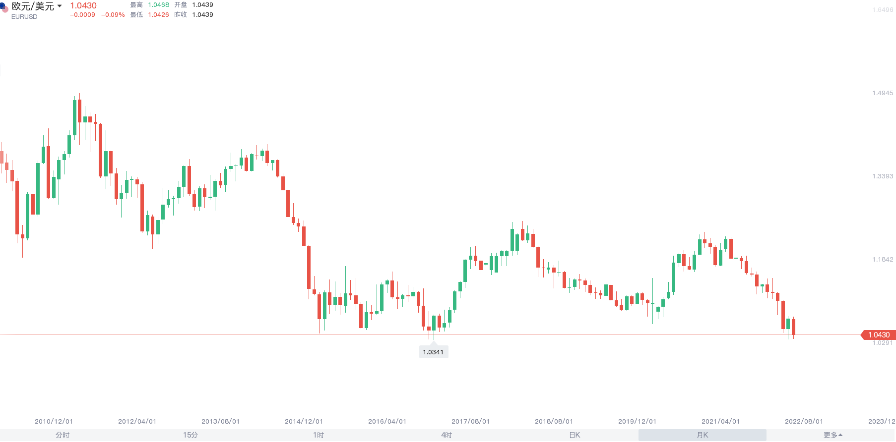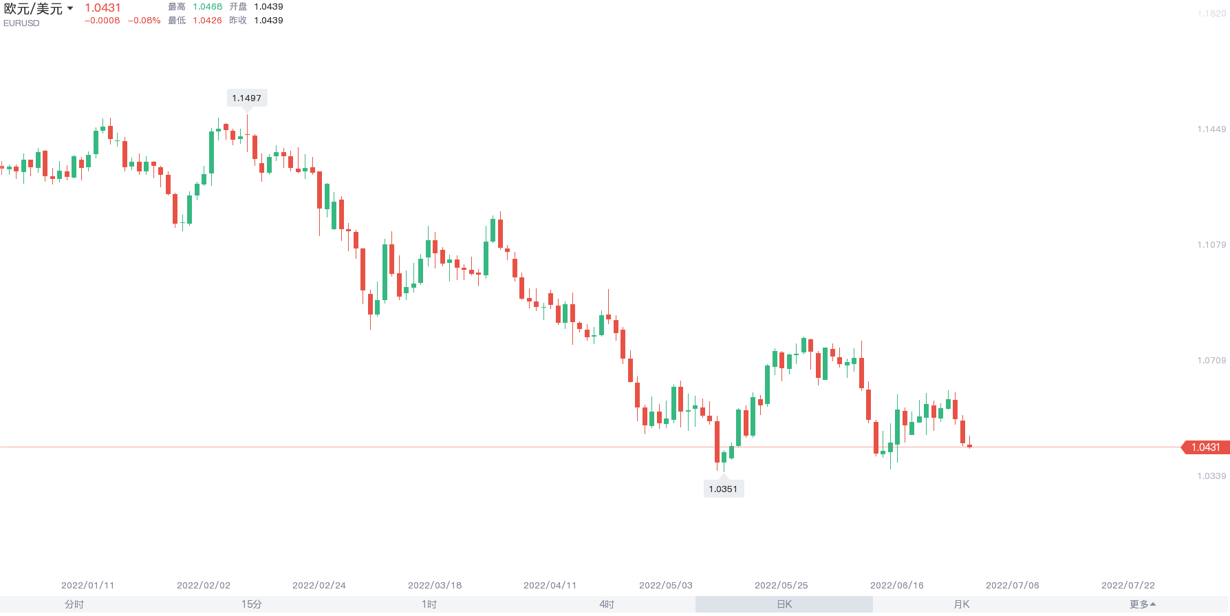欧元6月开盘开盘1.0732 最高1.0776 最低1.0360,截至目前,报价1.0433,本月已下跌3%