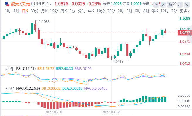 欧元3月开盘开盘1.0574,最高1.0932 最低0.0517,截至目前,报价1.0876,本月已下上涨2.81%,为第一季度表现最好的月份。