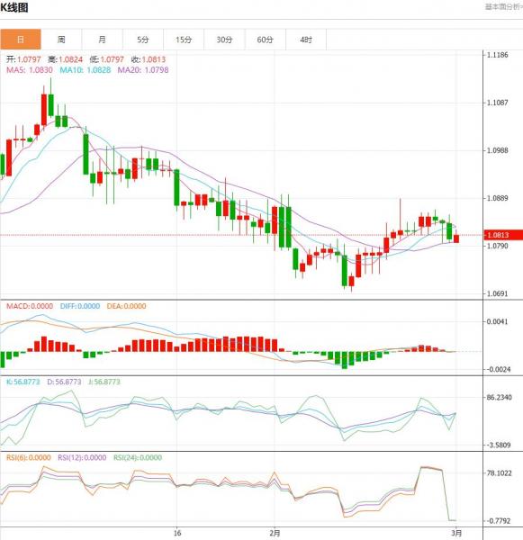 行情分析:汇价高见1.0824,低见1.0797。上一交易日,基本面上看,欧元昨日震荡下行,日线小幅收跌。除美元指数在美联储官员鹰派言论影响发酵支撑美元指数攀升的同时是施压欧元走软的主要原因外,时段内德国表现疲软的CPI数据也对汇价构成了一定的打压。技术面上看,周五,欧元/美元日内小幅上涨至1.0800以上。欧元区的数据显示,2月份核心HICP按年率计算增长了3.1%。这一数据高于市场预期的2.9%,支撑了欧元。日线图上,欧元兑美元最近在1.09附近上涨受阻,价格在100期均线和200期均线的下方。相对强弱指数指标略低于50,突显出复苏势头不足。如果欧元兑美元设法稳定在1.0820上方并开始使用该水平作为支撑,1.0860(上升趋势线)将起到阻力作用,在此之上的阻力区域为1.0900-1.0910(心理水平,斐波那契50%回撤线)。如果行情走弱,收盘低于1.0800可能会吸引技术性卖家,并为向1.0760和1.0720的下跌打开大门。