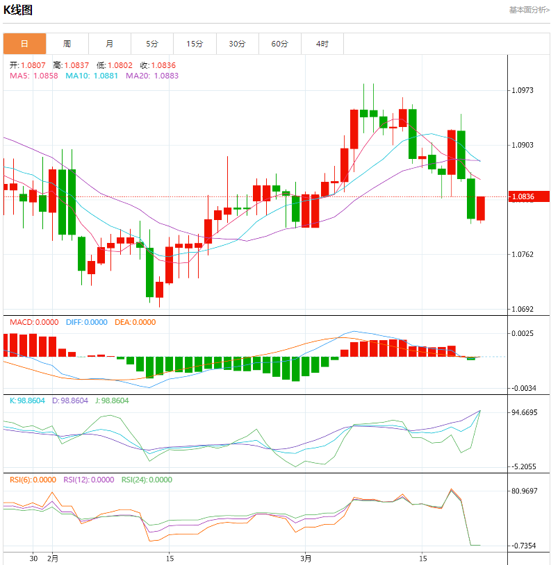 周一盘中,欧元/美元上升至0.0026点位,增幅0.24%。欧元兑美元上周表现不佳,美联储在3月FOMC会议上出人意料地表现温和,但欧元兑美元并未从中受益。由于未来一周没有什么事件风险可言,且价格跌破多条移动平均线,逢高卖出受到青睐。