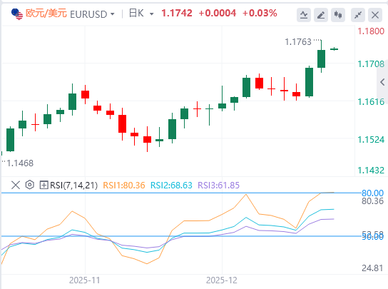 欧元/美元最终突破1.1600-1.1650区间顶部,涨幅突破1.1700,交易者关注1.1800。相对强弱指数(RSI)显示,多头动能增强,显示出进一步上涨空间。