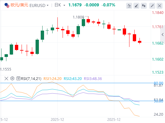 从技术图形看,欧元兑美元延续近期跌势,目前交投于1.1680附近。日线图显示走势偏向看跌:14日相对强弱指数(RSI)位于43.22,表明下行动能正在累积。