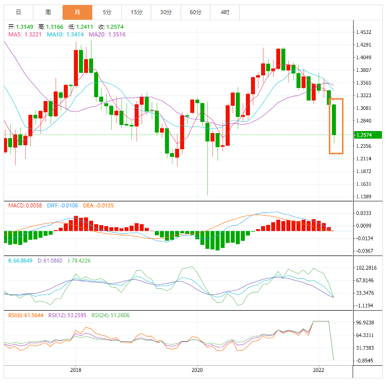 自俄乌冲突升级以来,英镑便一直处在低位。当周,英镑又出现了一波大跌,英镑兑美元汇率已来到2020年7月以来的新低,接近近两年最低点。本轮英镑下跌的主要原因,主要受到俄乌战局的影响,有消息称美国有意让乌克兰加入北约组织的意图,再度加剧了俄乌局势的恶化。还有就是英国央行加息预期的降低。货币市场一直在下调对英国央行加息规模的预期,市场目前普遍预计英国央行年底前将加息约140个基点,上周五这一预期为160个基点。另外,最新数据显示,2021/22财年英国政府借贷数额比预期高出近20%。
