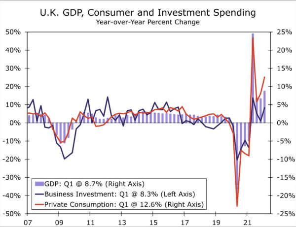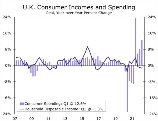对英国第一季度GDP的最终估计显示,经济增长率仍然可观,环比增长0.8%,同比增长8.7%。在细节方面,消费者支出环比增长0.6%,但商业投资下降0.6%。虽然英国通胀几个月来一直处于上升趋势,但价格增长似乎对第一季度经济增长只有适度的抑制作用。也就是说,自4月份以来,通货膨胀压力进一步加剧,最新一轮的电价上涨现已生效。事实上,仅4月份,电价就环比上涨了40.5%,天然气价格上涨了68.8%。这些增长导致截至5月份最新读数的总体通胀率为9.1%。这些能源价格上涨,以及更广泛的价格上涨,预计将越来越多地拖累未来的家庭实际收入和消费者购买力。另一个可观的电价涨幅定于10月,可能在30%-40%的范围内,英格兰银行估计,这可能会将整体CPI通胀率提高到或超过11%。