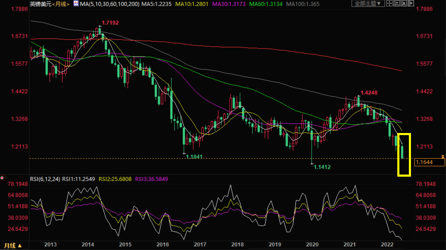 英镑兑美元当周创出2020年3月末以来新低至1.1716后反弹转升。物价压力已经接近40年高位,政府在改善劳动力成本方面完全失败,家庭面临更多能源账单压力。英国央行预测,由于能源费用飙升将通胀推高至两位数,英国将在今年晚些时候陷入衰退。这可能对英镑造成重大影响。