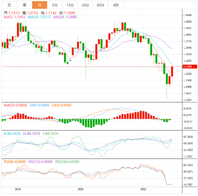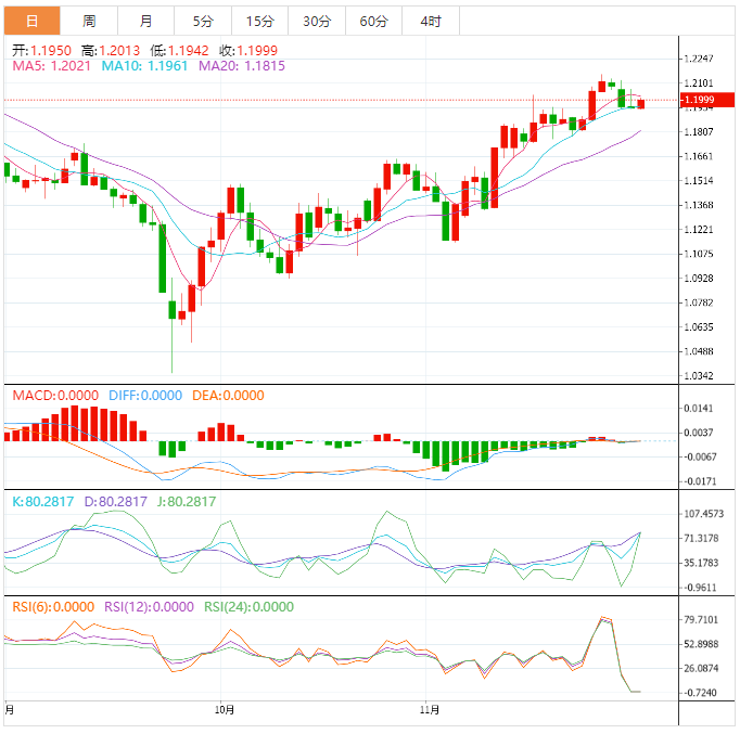 11月英镑表现稳定,连续第二个月上涨,11月开盘价为1.1458,目前汇价1.2000(截止目前),11月已经上涨409点,11月24日触及最高点1.2153,11月累计上涨542点。