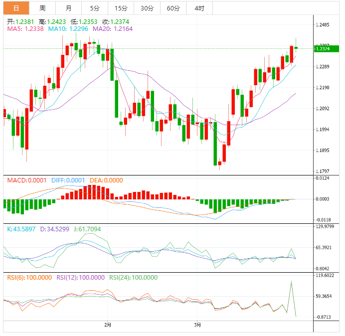 3月英镑表现稳定,月内趋势呈现直线上涨,对比2月小幅上涨,3月开盘价为1.2019,目前汇价1.2379(截止目前),3月已经上涨360点,3月31日触及最高点1.2423,3月8日最低点触及1.1802。