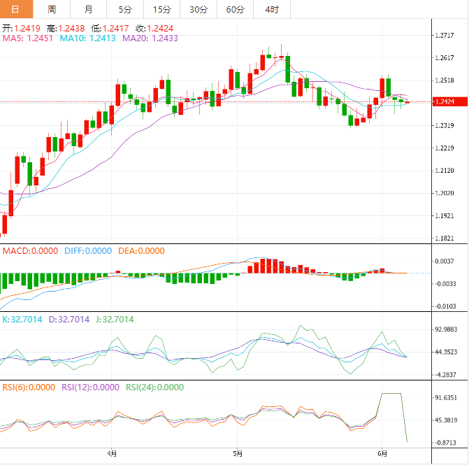 与此同时,英镑兑美元货币对的卖家需要得到上述支撑线(最晚接近1.2400)的确认。在此之后,不能排除快速下跌至5月底部1.2308的可能性。