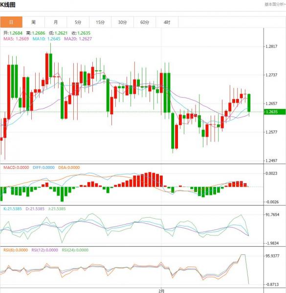 周三盘中,英镑/美元货币对为1.2636/1.2635,跌幅-0.38%。英镑兑美元周三走低,交投于50日移动均线切入位1.2650附近。如果未来几个交易日涨势加快,趋势线阻力位1.2725将是抵御看涨攻击的第一道防线。