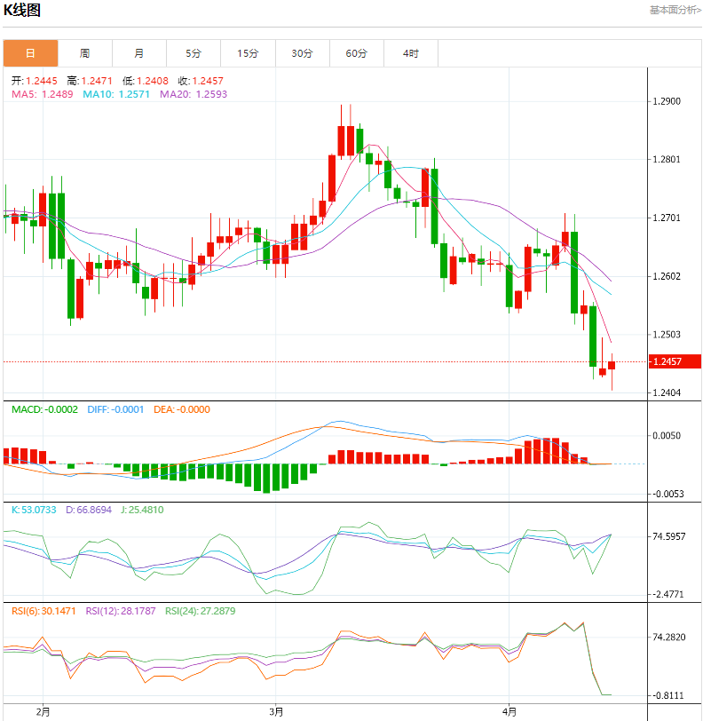 交易策略:可以在1.2520---1.2420的区间下限买入,有效破位30个点止损,目标在区间的上限。