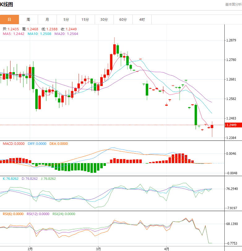 交易策略:可以在1.2470---1.2420的区间下限买入,有效破位30个点止损,目标在区间的上限。