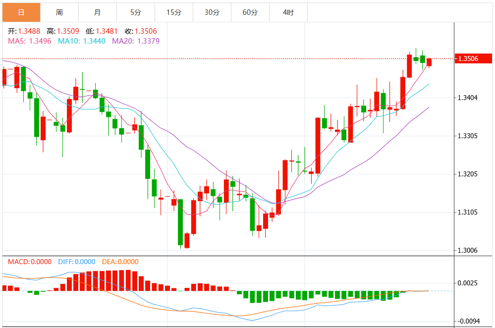 周一欧市盘中,英镑兑美元交投于1.3496,跌幅为0.01%。