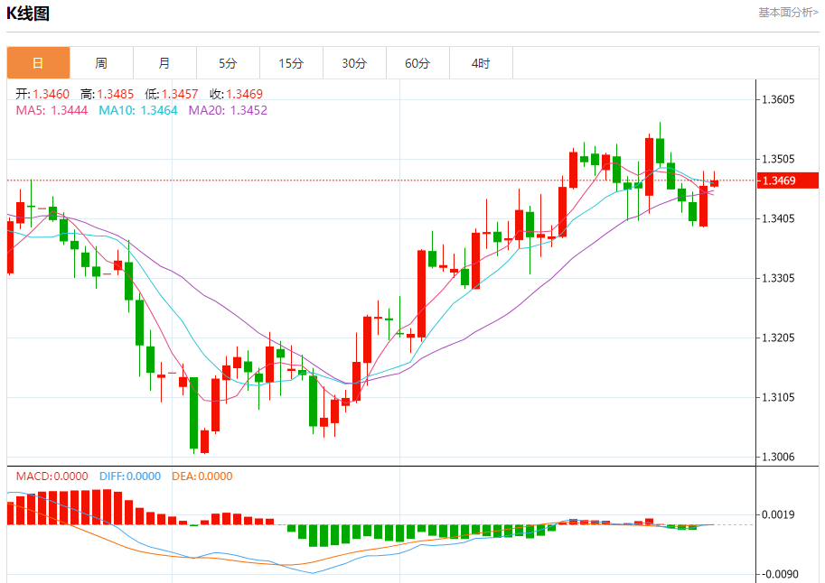 英镑/美元持平在1.3463附近。20天指数移动平均线1.3442正在上升,价格将守在上方以维持短期上涨空间。