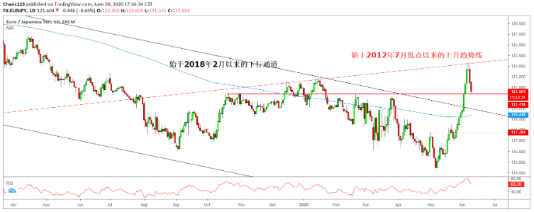 反之,若欧元/日元能继续企稳在该通道上方,则仍具有看涨前景,上方目标看向上周创下的年内高点124.43(同时也是始于2012年7月低点以来的上升趋势线)。