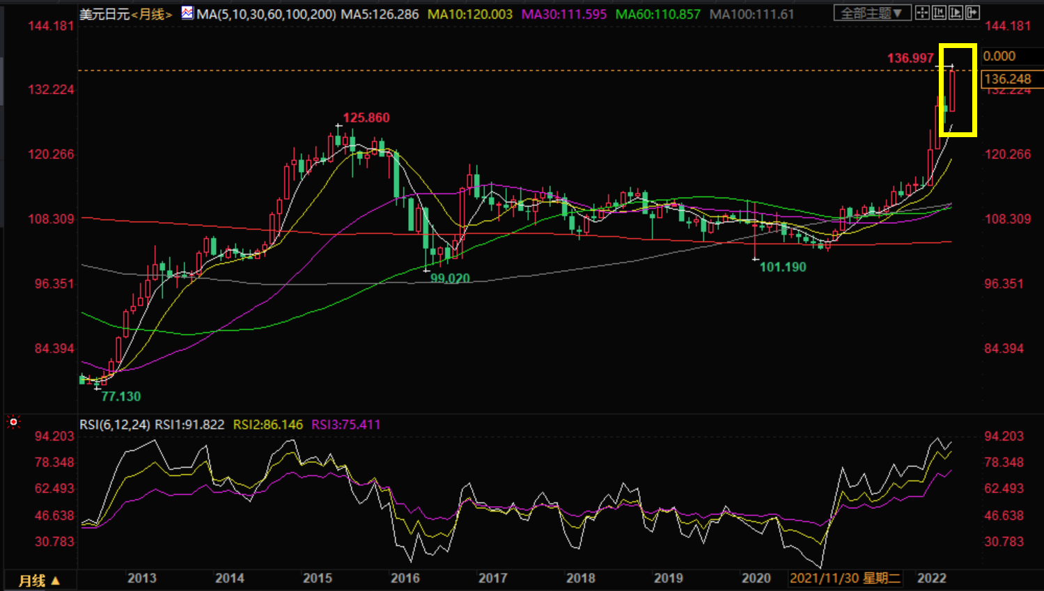 美元兑日元当周上涨0.22%至134.699,盘中创1998年10月上旬以来新高至135.585。日本央行成为唯一继续捍卫超宽松货币政策的主要经济体,日元贬值之路未完,美元兑日元或升至137。日本央行宣布维持货币政策不变,并再次宣布推出额外的紧急债券购买操作,重申将密切关注外汇市场进展及其对日本经济活动的影响,继续施压日元。在西太平洋银行(Westpac)经济学家看来,日元的贬值之路还将继续,干净利落地突破135.20水平将开启更多新的上行空间,也许最初目标指向137水平。