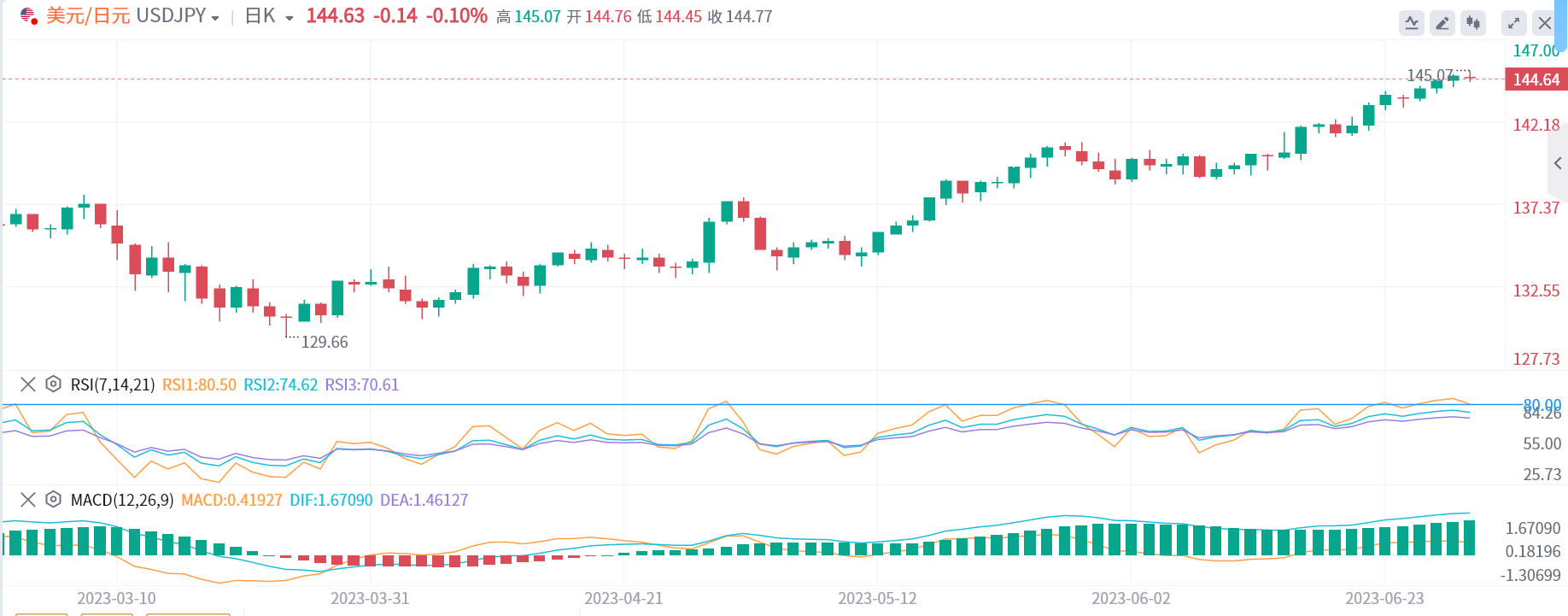 美元/日元6月开盘报价140.96,最低触及133.51.近期日元持续贬值,而日本政府表现出的干预态度亦未能挽回日元疲态。据《日本经济新闻》6月29日报道,日本财务省副大臣神田真人表示,若日元汇率变动过大,日本政府将做出“适当回应”。本周初,神田真人曾称日元汇率贬值是“快速且片面的”。在他表态后,日元汇率略有回升,但不久日元兑美元又跌至1美元兑144日元区间,陷入近7个月来的最低点。今日公布的东京6月核心CPI同比上涨3.2%,低于市场预期的3.3%后,日元兑大多数G-10走弱,截至发稿,美元/日元报价144.61。
