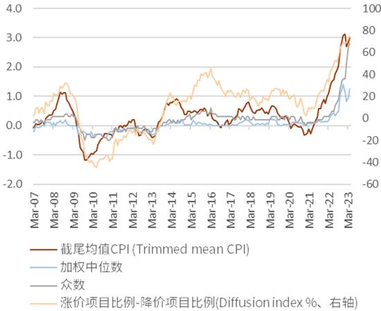1、通胀压力加大:今年上半年日本的通胀压力仍旧增加,政府通过补助金的方式降低了电费等物价,但是排除能源项目后的通胀仍然处于高位。5月东京地区CPI显示除去生鲜食品与能源的通胀同比上升至3.9%,为1983年以来的最高水平。日本央行所重视的通胀趋势的各类指标也显示通胀压力在持续上升。但同时也需要留意的是日元计价的进口物价同比在4月已经转负、PPI同比也在快速回落(图表56),这些成本端通胀压力的减少有助于减少日本通胀“爆表”的可能性,同时伴随成本端因素的减少,未来的通胀更趋近于需求端所导致,在这种背景下日本央行对通胀也更好掌控。