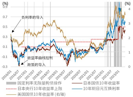 2、调整YCC的成本有限:2022年末、2023年初讨论日本央行调整YCC的风险时必然会考虑“调整后被投机资金挑战(BOJ attack)”的风险。而如今情况发生了很大改变,美国通胀已经明确见顶,美债10年利率超过2022年高点为小概率事件。在全球利率上行压力较低的背景下,日债利率在近期也出现了明显下行。自3月9日以来日债10年利率都几乎未触碰过日本央行所设0.5%上限,“固定利率操作”在过去3个月都处于“封印”状态,目前日债10年利率降至0.4%附近、日元10年互换利率降至0.6%附近。在目前背景下日本央行调整YCC所受到的挑战相较此前明显减少。