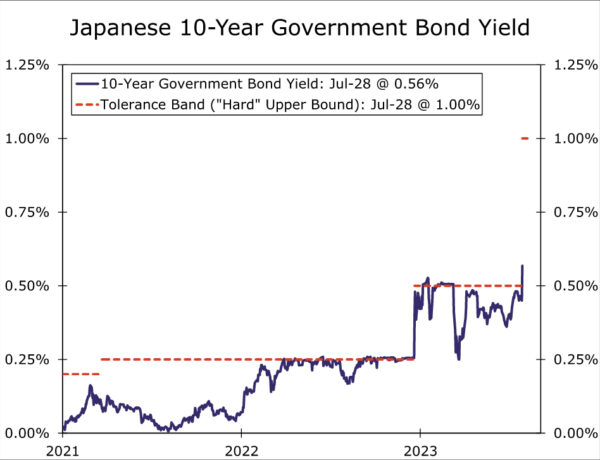 日本央行对今天的货币政策宣布感到意外,对其收益率曲线控制政策进行了又一次鹰派调整,这一举措比之前预测的10月份调整发生得稍早。就其主要政策参数而言,日本央行将其政策平衡率保持在-0.10%,并表示将继续将10年期日本国债收益率定为0%,波动幅度为+/-50个基点。然而,重要的是,日本央行表示,它将“以更大的灵活性进行收益率曲线控制,将区间的上下限视为市场操作的参考,而不是严格的限制。”日本央行还表示,如果需要,它将通过固定利率购买操作,以每天1.00%的价格购买10年期日本国债。实际上,这一变化意味着日本央行将把10年期日本国债收益率限制在1.00%,或者更准确地说,实际上,在0.50%到1.00%之间。