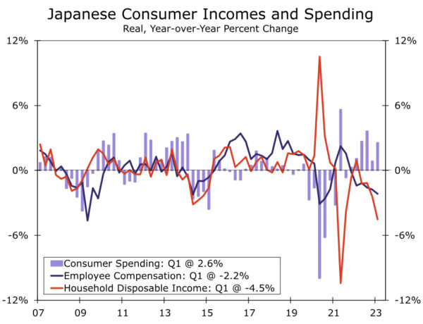 总的来说,日本的政策调整主要是出于操作和战术考虑,在此背景下,预计日本央行不会在短期内再次进行政策调整。从纯粹的经济角度来看,宽松货币政策的理由越来越多,但还不是压倒性的。关于经济增长前景,日本确实在2023年开始时站稳了脚跟,第一季度国内生产总值年化季度环比增长2.8%,第二季度Tankan调查暗示,今年上半年将持续增长。然而,尽管工资增长加快了,但却没有跟上物价的上涨步伐,这意味着,从实际或通胀调整后的角度来看,员工薪酬和家庭收入的趋势已转为负值。负收入趋势最终可能会抑制消费者,并导致日本经济随着时间的推移失去动力。预计通胀将回落,事实上,日本央行自己的预测显示,中期通胀率将回落至2%以下。因此,从经济角度来看,我们认为在未来一段时间内没有强有力的理由收紧政策。从操作角度来看,也认为目前进一步调整政策的可能性有限。如果像预期的那样,全球货币政策紧缩在未来几个月结束,全球债券收益率的上行压力应该会减弱,全球债券回报率可能会开始走低。在这种环境下,我们预计10年期日本政府收益率暂时不会接近1.00%的“硬”收益率上限,因此,在实施货币政策方面,日本央行不会面临任何重大的新操作挑战。在这种背景下,我们认为日本央行的货币政策在可预见的未来保持不变,当然至少在2023年剩下的时间里保持不变。