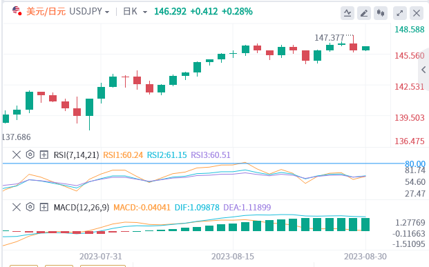 8月29日,美元兑日元涨至去年11月以来的最高水平,这可能会加大日本央行结束其超宽松货币政策以支撑日元的压力。在美联储主席鲍威尔提出进一步加息的可能性后,美元兑日元一度涨至147.377的高点,截至目前,徘徊在146.299附近。消费者信心的意外下滑将缓解市场对日本央行货币政策转变的预期。消费者信心减弱将预示着消费可能回落。日本央行正在监测国内需求和工资增长。在消费者需求和工资上涨的支持下,通胀动态的转变将使日本央行摆脱极端宽松的地位。