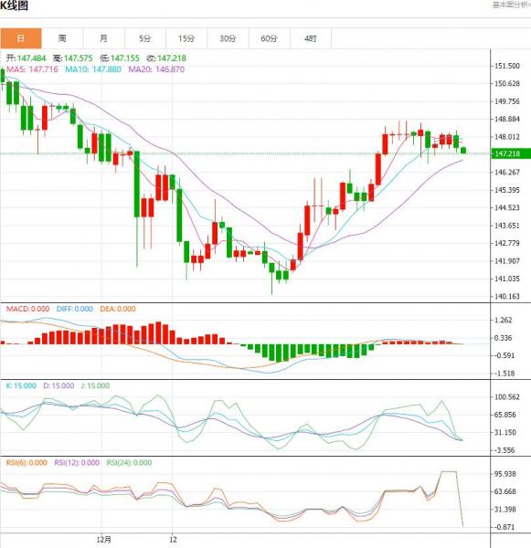 交易策略:可以在148.25---147.15的区间下限买入,有效破位40个点止损,目标在区间的上限。