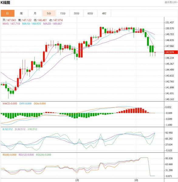 交易策略:可以在147.95---146.35的区间上限卖出,有效破位40个点止损,目标在区间的下限。