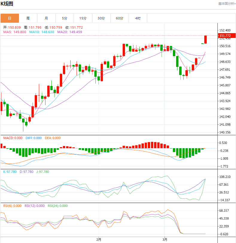 交易策略:可以在151.50---150.40的区间下限买入,有效破位40个点止损,目标在区间的上限。