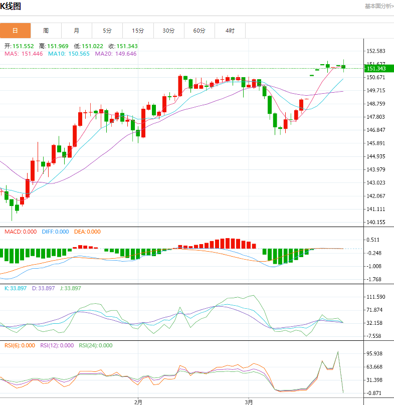 行情分析:汇价高见151.969,低见151.022。上一交易日,基本面上看:日本官员正试图再次用言论打压高涨的美元兑日元。日本外汇事务最高官员称最近几周的走势反映的不是基本面,而是投机活动。虽然这种说法有一定道理,但套利交易继续推动日元走软,使其徘徊在几十年来的高点附近。日元疲软的技术形态预示着未来上涨的风险。如果这种情况继续下去,不排除采取任何措施来对抗这种情况。技术面上看,美元兑日元H4级别高位震荡上行,同时MACD量能柱和双线在零轴上方缩量。尽管日本央行宣布了2017年来的首次加息,并在此过程中放弃了负利率,但加息幅度仅为10个基点,也没有承诺随后会再次加息。