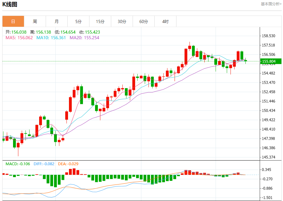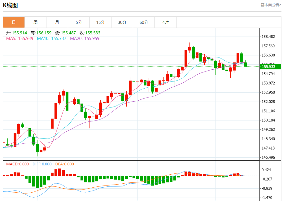 今日周四,截止目前美元兑日元报155.823,下跌0.12%。