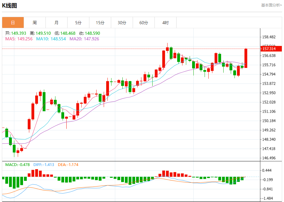 今日周五,截止目前美元兑日元报157.327,上涨1.20%。