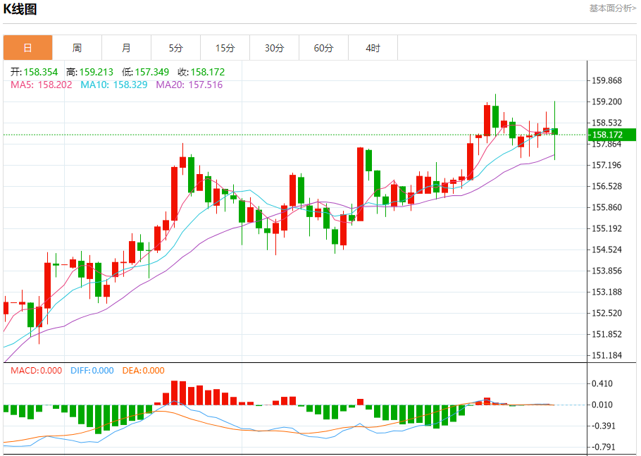 周五纽盘,美元兑日元交投于158.208,跌幅为0.12%。